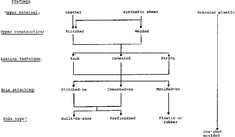 The six constructional methods considered in this memorandum are only a small proportion of the possible combinations of methods shown on the chart. For example, shoes having stitched leather uppers and cemented-on prefinished soles could be lasted using tacks, cement or string, but only the combination involving cement lasting is dealt with. However, all the techniques required to construct the tack and string-lasted alternatives are dealt with in the context of other types. In all, forty-six different construction methods are possible using the alternatives shown in Figure I.1. Although these forty-six methods cover far from all the possible forms of footwear construction, it is likely that they account for about ninety per cent of the total output volume of non-rubber footwear. Rubber footwear are outside the scope of this memorandum.