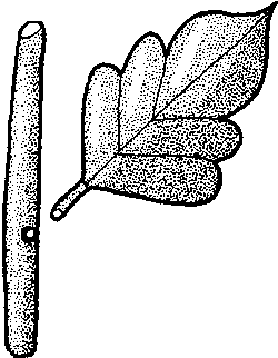In order to make a joint, a cylindrical hole must be drilled in the support piece and the male end of the part to be mounted must be filed to the same nominal diameter. In the example given in figure VII.5, it is a leaf stalk. Parts may be assembled with a tight or loose fit. If a tight fit is required, the diameter of the male part should be slightly larger than that of the hole. The pieces must be forced together in order to obtain a rigid assembly. If the diameter of the male part is slightly smaller than that of the hole, the assembly will be loose. It may be made rigid by placing a small quantity of adhesive in the hole before assembling the parts.