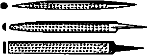 Filing is done with wood files. The three types shown in figure III.8, which are 200 mm long, are perfectly adequate in most cases. Two sets are necessary: one with large teeth for making the rough model and another with small teeth for finishing before polishing.