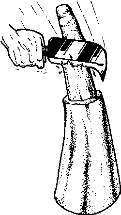 The mounting shown in figure III.16 is easy to do and enables the outside of a whole horn to be turned on the lathe while being held between stocks. The drilled hardwood corner allows the horn to be fixed on the tip of the headstock. This type of mounting is particularly recommended for the rapid cleaning and polishing of untreated horn.
