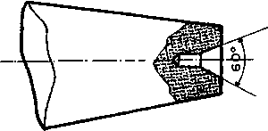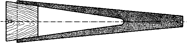In order to hold the piece tightly when using a mandrel, protective jaws previously milled to the shape of the horn should be used. If, however, a piece of both hollow and solid horn is to be worked, it may be held either with a mandrel or with mandrel and stocks, the solid section being held at its end by the tail-stock. Whenever a tail-stock is used, a central hole must be drilled (figure III.14) with a centre bit (figure III.15) at the end of the horn held by the tail-stock. Except in cases where short lengths are to be used, the horn must be heated and straightened before being mounted on the lathe. A brilliant finish can be obtained by polishing the horn on the lathe with oiled sandpaper.