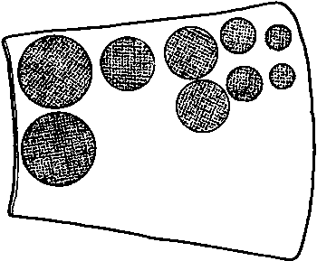 Any section of horn can be used to produce buttons, as shown in figures IX.1 and IX.2. Buttons may be cut from a flattened hollow horn section, as illustrated in figure VI.1. Smaller buttons are cut from areas close to the base of the horn where the walls are thinnest. Larger and thicker buttons should be cut progressively towards the solid section of the horn. Very large buttons may be made by cross-cutting the solid section of the horn, as shown in figure VI.2. This method enable buttons of standard thickness to be obtained.