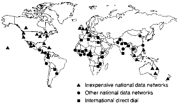 In areas where there are inexpensive data network services (mostly in the North and some Southern capital cities such as Mexico City), users use a local phone call to access the data network, which puts them in touch with CGNET. A low-cost (US $60 to $150) modem can be used. In some countries, the data networks can be expensive, because they charge high rates, or because a long-distance call is needed to reach them. This increases the cost per page, and a more expensive (US $200) modem is recommended to compensate for noisy telephone lines. In countries that do not have national data networks, users must dial a network in another country, which considerably increases costs. High-quality modems (US $600) must be used to ensure error correction.