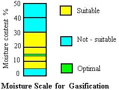 The moisture content of the most biomass fuel depends on the type of fuel, it´s origin and treatment before it is used for gasification. Moisture content of the fuel is usually referred to inherent moisture plus surface moisture. The moisture content below 15% by weight is desirable for trouble free and economical operation of the gasifier. Higher moisture contents reduce the thermal efficiency of gasifier and results in low gas heating values. Igniting the fuel with higher moisture content becomes increasingly difficult, and the gas quality and the yield are also poor . |