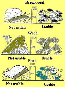 The fuel size affect the pressure drop across the gasifier and power that must be supplied to draw the air and gas through gasifier. Large pressure drops will lead to reduction of the gas load in downdraft gasifier, resulting in low temperature and tar production. Excessively large sizes of particles give rise to reduced reactivity of fuel, causing start-up problem and poor gas quality. Acceptable fuel sizes depend to certain extent on the design of gasifier. In general, wood gasifier work well on wood blocks and wood chips ranging from 80x40x40 mm to 10x5x5 mm. For charcoal gasifier, charcoal with size ranging from 10x10x10 mm to 30x30x30 mm is quite suitable. |