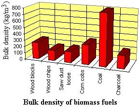 Bulk density is defined as the weight per unit volume of loosely tipped fuel. Bulk density varies significantly with moisture content and particle size of fuel. Volume occupied by stored fuel depends on not only the bulk density of fuel, but also on the manner in which fuel is piled. It is also recognised that bulk density has considerable impact on gas quality, as it influences the fuel residence time in the fire box, fuel velocity and gas flow rate. |
