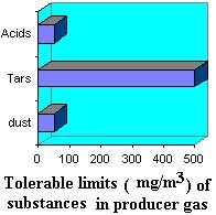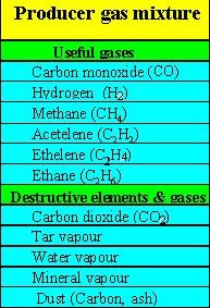 Producer gas leaves the gasifier as the mixture of combustible and non-cobustible gases alongwith tar vapour, water vapour, dust, mineral vapour. Sulphur compounds such as hydrogen sulphide (H2S) and nitrogen compounds (NH3 , HCN) in producer gas are undesirable as their condensates are corrosive and pollutants in exhuast gases. The generation of H2S is of little importance in gasification of biomass as long as sulphur content does not exceed 0.5%. The amount of NH3 and HCN in the gas depends on the nitrogen content of the fuel. Fuel with nitrogen content less than 2 % is safe for gasification. Silicon oxide (SiO2) and iron oxide (Fe2O3) in dust are important because of their abrasive nature. |