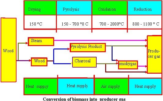 The essence of gasification process is the conversion of solid carbon fuels into carbon monoxide by thermochemical process. The gasification of solid fuel is accomplished in air sealed, closed chamber, under slight suction or pressure relative to ambient pressure. Gasification process occuring in general explained in this section.