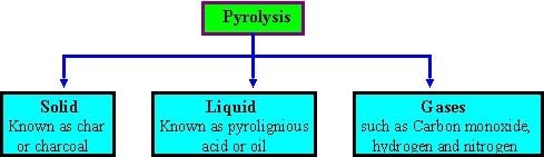 Pyrolysis is the themal decomposition of biomass fuels in the absence of oxygen. Pyrolysis involves release of three kinds of products : solid, liquid and gases. The ratio of products is influenced by the chemical composition of biomass fuels and the operating conditions. The heating value of gas produced during the pyrolysis process is low (3.5 - 8.9 MJ/m 3 ).