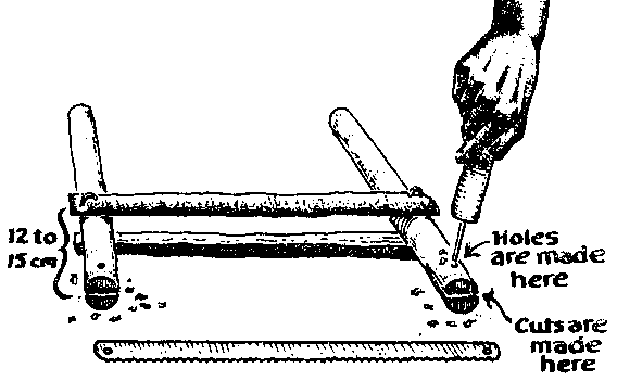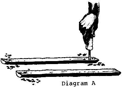 First, a hole is made near each end of the two split pieces of wood using the drill. Drill the holes wide enough for a 6/½ cm nail to be hammered through without splitting the wood. The holes should be 3 to 5 cm from the ends of the sticks. This procedure is shown in Diagram A. Next, drill one hole in each of two of the other pieces of wood. Each hole is 12 to 15 cm from one end of the wood. This procedure is shown in Diagram B.