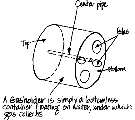 · To prevent the gas tank from floating too high and letting gas escape, crossbars are located at a height such that when the floating tank is full of gas, its bottom remains eight inches below the tim of the water tank.