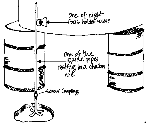 4) Making sure that the gas holder was completely vertical, so that gas could not accidentally escape, the four guide pipes with their couplings and short lengths screwed on were placed on the ground. A small hole was dug around each splayed foot to a depth of 6.0 inches below ground level and a little concrete was poured into and around each.