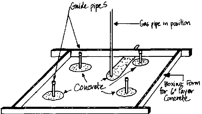 7) With the site clear except for the four short pieces of guide pipe with couplings and the gas pipe, the water tank was tested for fit by placing it over the four short guide pipe pieces. Boxing for concrete 6.0 inches deep was then made on all four sides, and the water tank was removed.