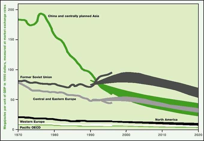 Primary energy intensity (megajoules per 1990 dollar of gross world product) |