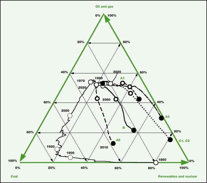 Three of the six scenarios will be used to illustrate alternative conditions for achieving transitions of energy systems towards sustainability. Table 9.2 provides a number of indicators that may be used to characterise the achievement of sustainable development in energy scenarios and shows how the three scenarios selected for this assessment fare in comparison with each other. The middle-course scenario (B) was chosen to serve as a reference baseline because it was designed to represent a future characterised by incremental and gradual changes. In fact, this scenario would represent a major improvement in the global energy system and its use, but it does fall short of fulfilling many indicators of the sustainability suggested in table 9.2. The other two scenarios shown in table 9.2 (A3 and C1) describe futures that include characteristics of sustainability. The third scenario (C2), which can also be characterised along the same lines, includes continuous reliance on nuclear energy, in contrast to the other ecologically driven scenario, which has a global nuclear phaseout by 2100 (C1). Neither the A3 nor the C1 scenario, however, is compatible with current trends and developments, so both would require new policy initiatives and measures directed towards achieving sustainable development. Even so, neither of the scenarios ranks very high on all 13 indicators of sustainability considered in table 9.2. At the same time, table 9.2 indicates that, among the spectrum of energy futures considered here, C1 represents the energy future that is the most compatible with sustainable development.