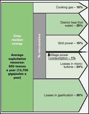As in the case of the village-scale trigeneration system described above, with this technology the very poorest households could pay enough for electricity and clean cooking fuel to satisfy their basic needs by gathering residues from the fields of rich farmers and delivering the residues to the energy conversion plants, thereby monetising their labour.