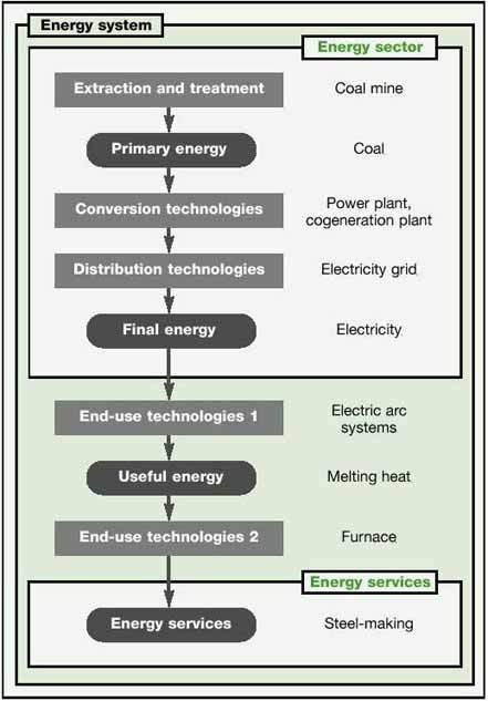 The energy chain that delivers these services begins with the collection or extraction of primary energy that, in one or several steps, may be converted into energy carriers, such as electricity or diesel oil, that are suitable for end uses. Energy end-use equipment - stoves, light bulbs, vehicles, machinery - converts final energy into useful energy, which provides the desired benefits: the energy services. An example of an energy chain - beginning with coal extraction from a mine (primary energy) and ending with produced steel as an energy service - is shown in figure 1.