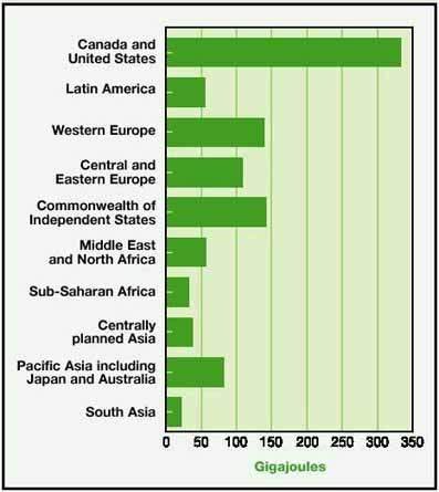 Per capita consumption of primary energy in the United States was 330 gigajoules in 1995, more than eight times as much as used by an average Sub-Saharan African (who used 40 gigajoules that year when both commercial and traditional energy are included). Many people in the least developed countries use much less. Figure 2 shows commercial and non-commercial energy consumption in various regions.