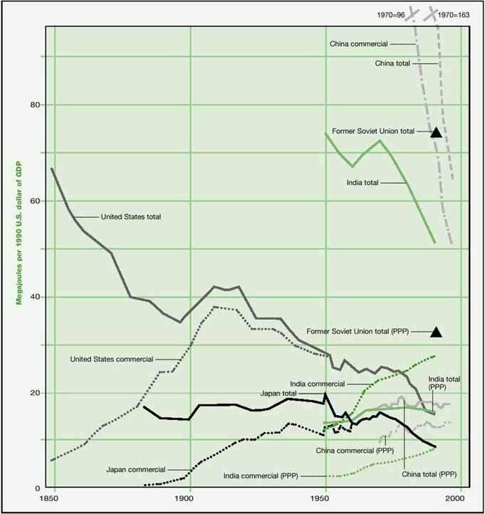 The trend towards a reduction in energy intensity as economic development proceeds can be discerned over a long historical period, as shown in figure 4, which includes the developing country examples of China and India. A detailed, long-term analysis of energy intensity for a number of countries reveals a common pattern of energy use driven by the following factors:
