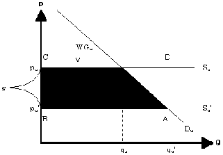 The welfare effect in the used-clothes market (Diagram 2u above) is clearly positive: Consumer surplus increases by the shaded area, and there is thus a welfare gain labeled WGu. The domestic clothing industry (Diagram 2d above) faces a fall in demand, which leads to a lowering of price from pd to pd', and a smaller quantity sold, qd' rather than qd. This implies a reduction in consumer surplus, and a reduction in producer surplus as well, for a net welfare loss equal to the shaded area labeled WLd. In the imported new-clothes sector (Diagram 2i above), there is also a fall in demand, and therefore also a fall in consumer surplus of the shaded area, a welfare loss labeled WLi. Finally, the other goods and services sector may absorb the production factors (labor, capital, etc.) released by the domestic clothing industry, thereby increasing production and generating some increase in consumer as well as producer surplus (WGo, not shown).