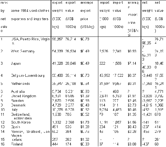 As one can see from the arguments pro and con, food aid is a complex topic, and the results are not at all clear. We will look next at a few studies which develop some of these arguments in greater depth. In considering similar arguments for and against used-clothes aid, one may want to bear in mind that, even without the further subsidy of freight aid, used-clothes imports - even commercial imports - already represent very cheap goods, comparable to surplus food.