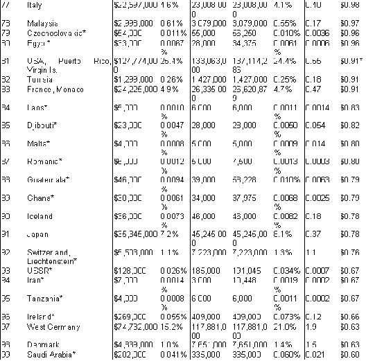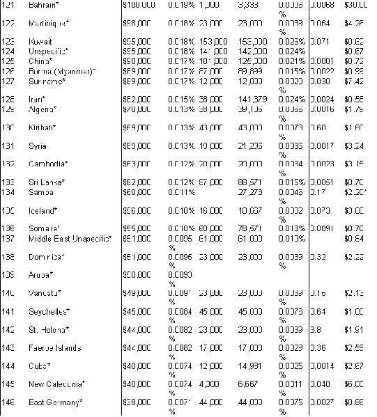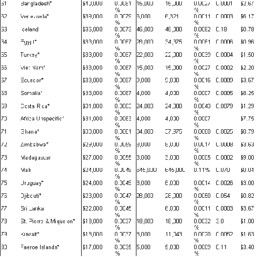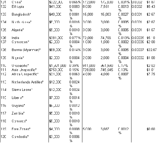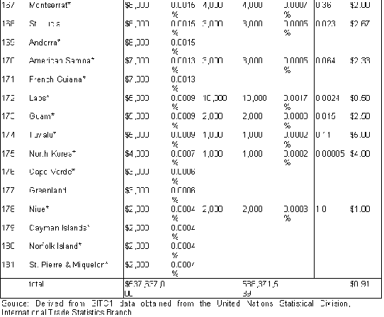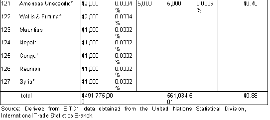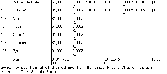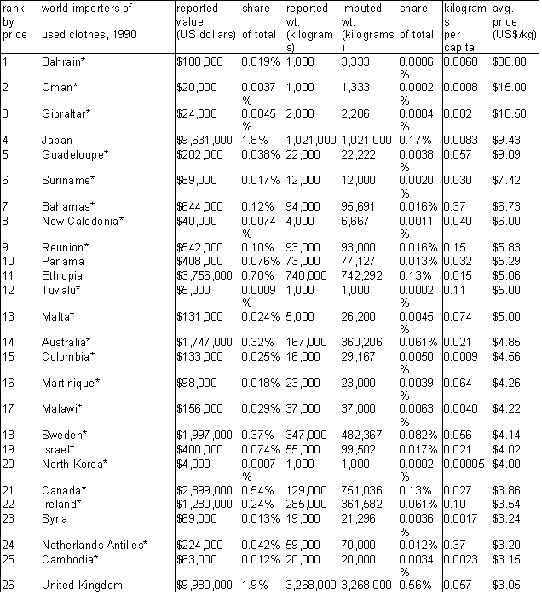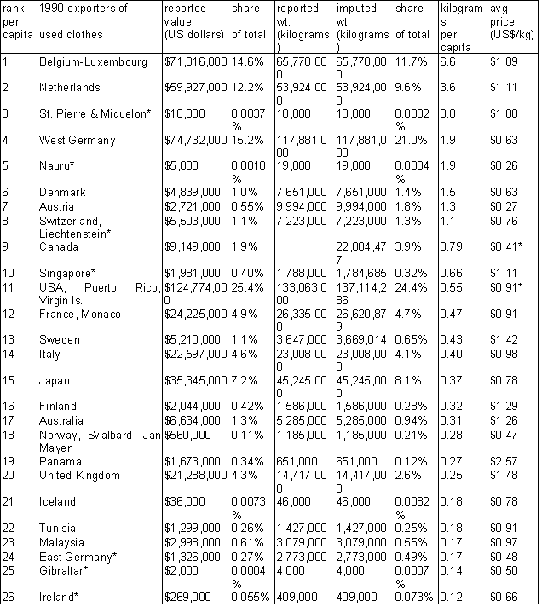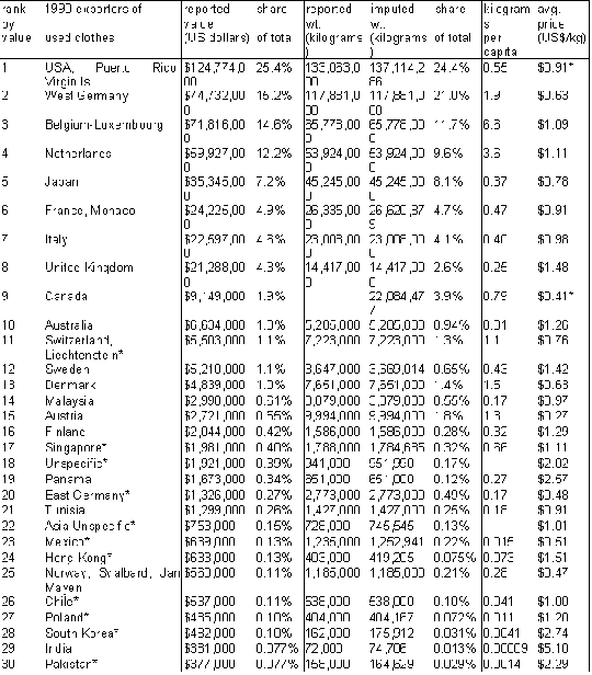The extent of international flows of used goods, commercial as well as charitable. The largest exporting countries and the largest importing (receiving) countries. The dominant kinds of goods. [The extent of commercial flows of used clothes worldwide is fully documented in the text, and data regarding private charitable flows of all types of goods from the U.S. is also given; international data is not kept on flows of other used goods, but a list of their known categories is included. International data collection does not distinguish charitable from commercial shipments.]