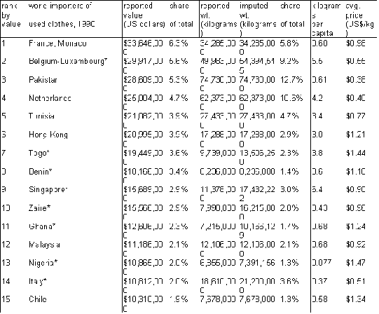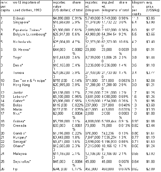 The quality and remaining life of the products. Maintenance of received materials. [These questions, specifically with reference to used clothes, are discussed at length in the text. There is an extensive literature on the use of second-hand equipment in development, but as these are producer goods rather than consumer goods, and thus raise quite different issues, we have chosen to focus at this time on used clothes, and suggest a separate project if further study is desired in this area.]