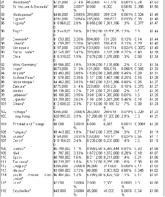 Often entire bales of used clothes or other apparel were simply missing or unaccounted for. A bale is generally worth more than one month's salary for a local employee, so it could represent a sizable temptation, either to employees or others, especially if the goods were perceived as "free" and "surplus" and were thus not tracked very carefully. For instance: "It is not known whether 96 bales of shoes [in Sierra Leone] were distributed free or sold." Seven bales of clothes "disappeared". In Zimbabwe, "the handling of second-hand clothes was problematic until the end of 1990, and it was difficult to obtain detailed information regarding the use of clothing bales during the period 1987-1990... 21.80 tonnes sent in 1989 and 18.79 tonnes of the 1990 consignment are missing from the general records of clothing received." Each ton is more than 20 bales, so this represented more than 800 salary-months. In Mozambique: "It has not been easy to obtain reliable statistics as to how clothing consignments have been used, particularly for the period 1982-1989."