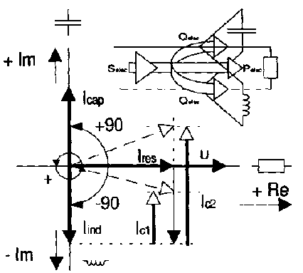 Fig 6 displays the compensation of a reactive load /L) with a capacitor. The inductive current Iind has to be compensated with the capacitive current Icap. Is Icap too small (lc1), we still find an under compensated load (inductive type). Is Icap too high (Ic2), we find an overcompensated load (capacitive type). To choose the correct capacitor we can use the following calculations (f is the line frequency):
