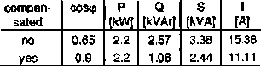 Suppose we have to determine the compensation cos j for the small grid described in Table 5. It is a single phase, 240/480V system (see chapter SWER) with S = 60 kVA installed power. The big loads use the 480V line to reduce the currents and simplify the compensation.