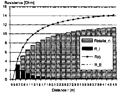 The resistance distribution it(r) is adequate. It is defined like Ohms law: it(r) = U(r)II, but takes into consideration that the resistance varies with the distance r from the earth contact.