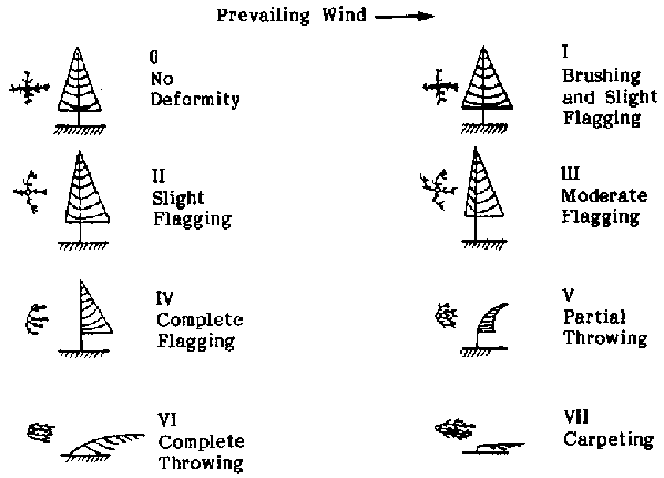 Figure 1 is one of the best guides to ranking tree deformities by wind speed. Both a top view and a side view of the tree are shown to demonstrate the brushing of individual twigs and branches and the shape of the tree trunk and crown. The figure uses the Griggs-Putnam classification of tree deformities described by indices from 0 to VII. When WECS sites are ranked by this scheme, only like species of trees should be compared, because different types of trees may not be deformed to the same degree.