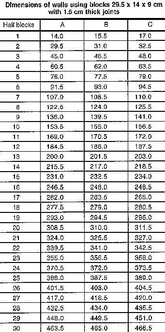 Coursing a plan assuming the use of a parallelepiped earth block measuring 29.5 × 14 × 9 cm, and 1.5 cm mortar joints. The wall thickness is equivalent to 1/2 a block.