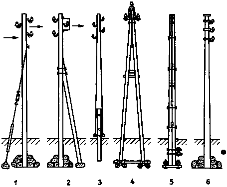 1 wooden pole with anchor, 2 pole with tie, 3 supporting pole with footing of reinforced concrete, 4 A-pole for large loads, 5 double A-pole, 6 concrete pole
