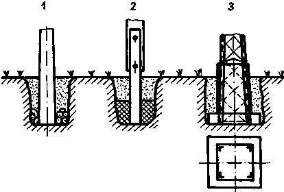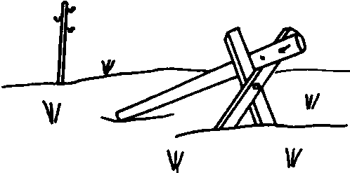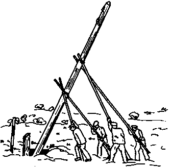 If in difficult territory it will be impossible to put up the poles by means of truck-mounted crane the poles may be erected aided by wooden rods being bound together in the shape of shears. For easing sliding of the poles into their pit, a sliding board or plank is placed vertically to the front wall of the poles pit. The vertical position of the pole is to be checked by means of a plummet or other measuring device.