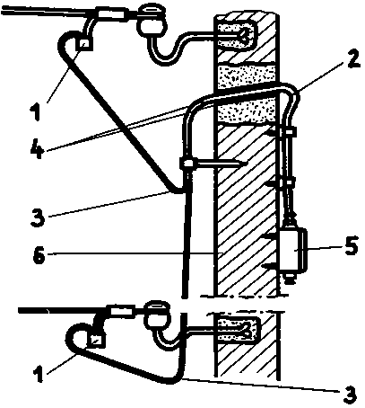 1 clamp, 2 cable, 3 dripping-off bend, 4 passage with tube, 5 junction box, 6 wall