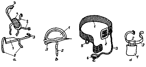 a) climbing iron: 1 foot support, 2 fixing straps, 3 holding tipb) protective helmet: 1 helmet, 2 chinstrap, 3 neck support