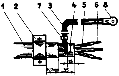 1 plastic sheath, 2 cable fixing clamp, 3 concentric conductor, 4 common conductor cover, 5 plastic insulation, 6 conductor, 7 clip 10 x 1 mm in a distance of approx. 120 mm, 8 cable terminal