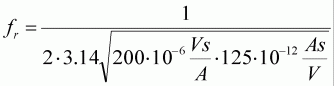 An alternating voltage of 500 mV is applied to a series connection of R = 250 W, L = 200 µH and C = 125 pF. Calculate the maximum possible current and the frequency fr at which this current will flow!