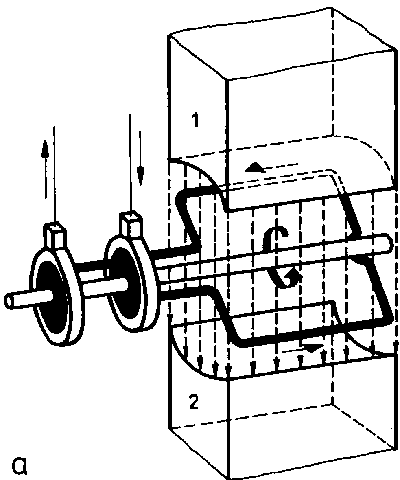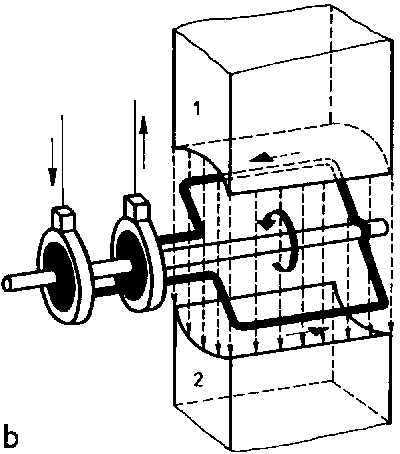 In horizontal position, the entire magnetic flux penetrates the loop, DF/Dt has the smallest value and the induced voltage is equal to zero. In vertical position, (parallel to the magnetic fields), the rate of flux variation DF/Dt is maximum and the induced voltage has the highest value. Upon further rotation, the voltage again drops and after half a revolution reaches the value of zero. In the further course, the voltage changes its direction and reaches its negative maximum value in vertical position. After one full revolution, the initial condition is again reached, the voltage has dropped to zero and another cycle with exactly the same course can begin. In Fig. 7.2., the described conditions are shown for eight selected positions of the conductor. The behaviour of the curve is a sine function.