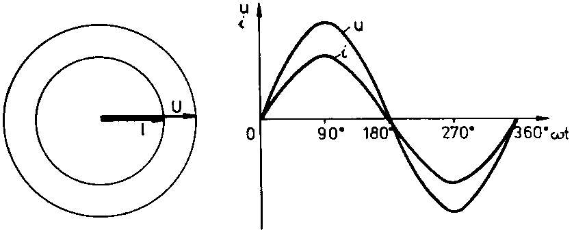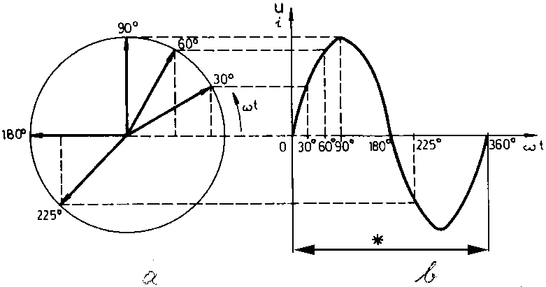 The alternating voltage or the alternating current is represented by a pointer (vector) capable of rotating whose length corresponds to the peak value. This pointer rotates anticlockwise at the angular velocity w. The pointer position at any time indicates the position of the conductor loop. In order to determine the instantaneous of voltage or current for any desired position, a straight line is drawn from the pointer tip to the horizontal axis which passes through the centre of the circle. The length of the straight line corresponds to the instantaneous value in question (Fig. 7.4.a). The particular advantage of the vector diagram is lucidity; a disadvantage is the fact that the conditions can be represented only for one point of time or for a few selected instants.