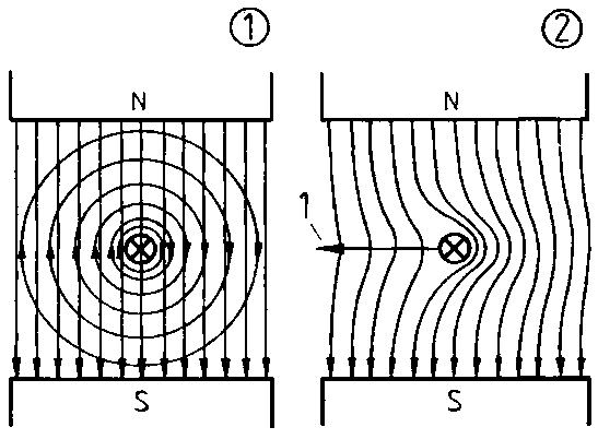 A current-carrying conductor is enclosed by a magnetic field. If this conductor is entered into a magnetic field, the individual fields are superimposed.
