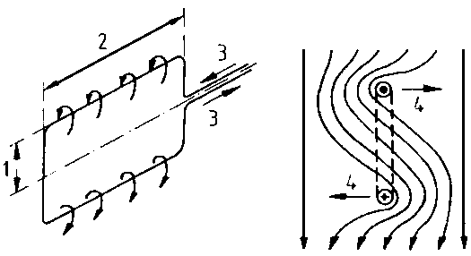 1 Radius, 2 Effective length, 3 Current direction, 4 Force action