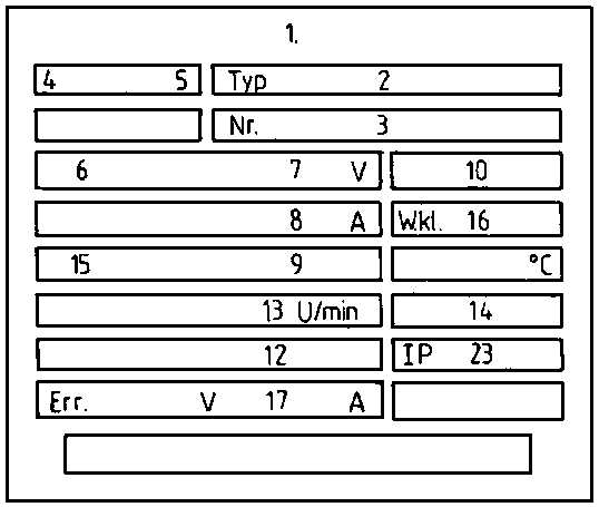 Rating plates of rotating electrical machines must provide information with regard to the keynote date of the machine in point. Such details are, moreover, necessary for assessing the suitability of the machine for linkage to adjacent technical facilities, mains, work units and prime movers. Consequently, rating plates feature a wealth of details concerning technical-physical dimensions and particular design characteristics. Moreover, additional data is similarly required for possible further fixtures. Such on-going data pertains, inter alia, to rated operating type. Machines in the power range of 0.001 kW to 1.1 kW must feature: