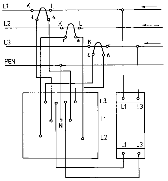 - Circuitry of a three-phase meter with two measuring systems.