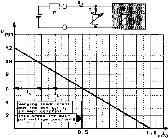 Here the overall current drawn from the supply will be kept constant by a component giving way for a current in a second path as soon as the voltage tends to increase above 6 V.
