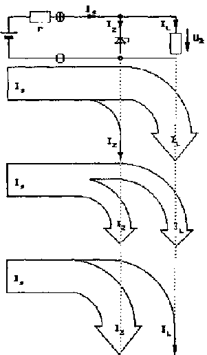 fig. 107 shows the typical graph of a Zenerdiode connected in series to a resister (here the internal resistor of the voltage source or even a special series resistor)