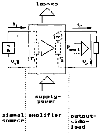 Beside the input-signal the amplifier is supplied with a supply voltage and a supply current, which means a supply power. This supply power is many times higher than the input signal power. Control-components (like for example transistors or triode valves) convert a more or less high percentage of the power into an output-signal. The part of the supply-power converted into the output signal is called the useful power Pout of the amplifer, while the rest of the supply power is dissipated as losses.