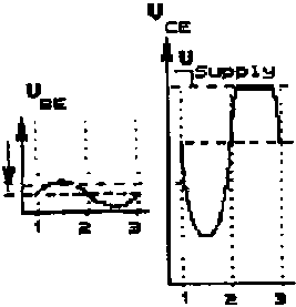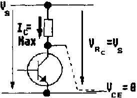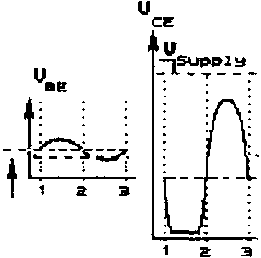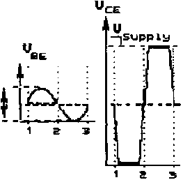 Let us imagine the amplifier is supplied with maximum input-voltage V1, so that the sinewave - produced at the output - has a peak-to-peak-voltage of almost full supply-voltage as shown in fig. 147a.