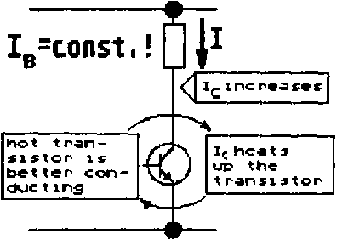 In case of our transistor in an amplifier-stage, the relatively high collector-current causes a rise in temperature. This increase of temperature causes a bigger conductivity in the transistor. Bigger conductivity lets rise the collector-current (even though the base-current is still the same). Even if this process is a slow one, the increase of collector-current, causes a decrease of output-voltage at quiescence, and therefore a drifting quiescence-voltage.